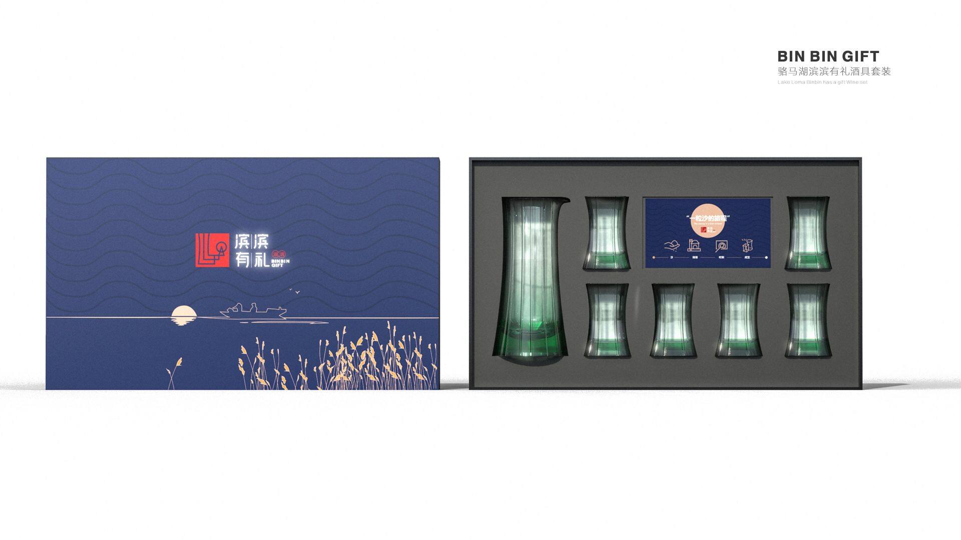 2.礼盒包装封面选取骆马湖的落日晚波美景,渔船,落日,芦苇,水鸟,营造出充满意境的生态骆马湖。