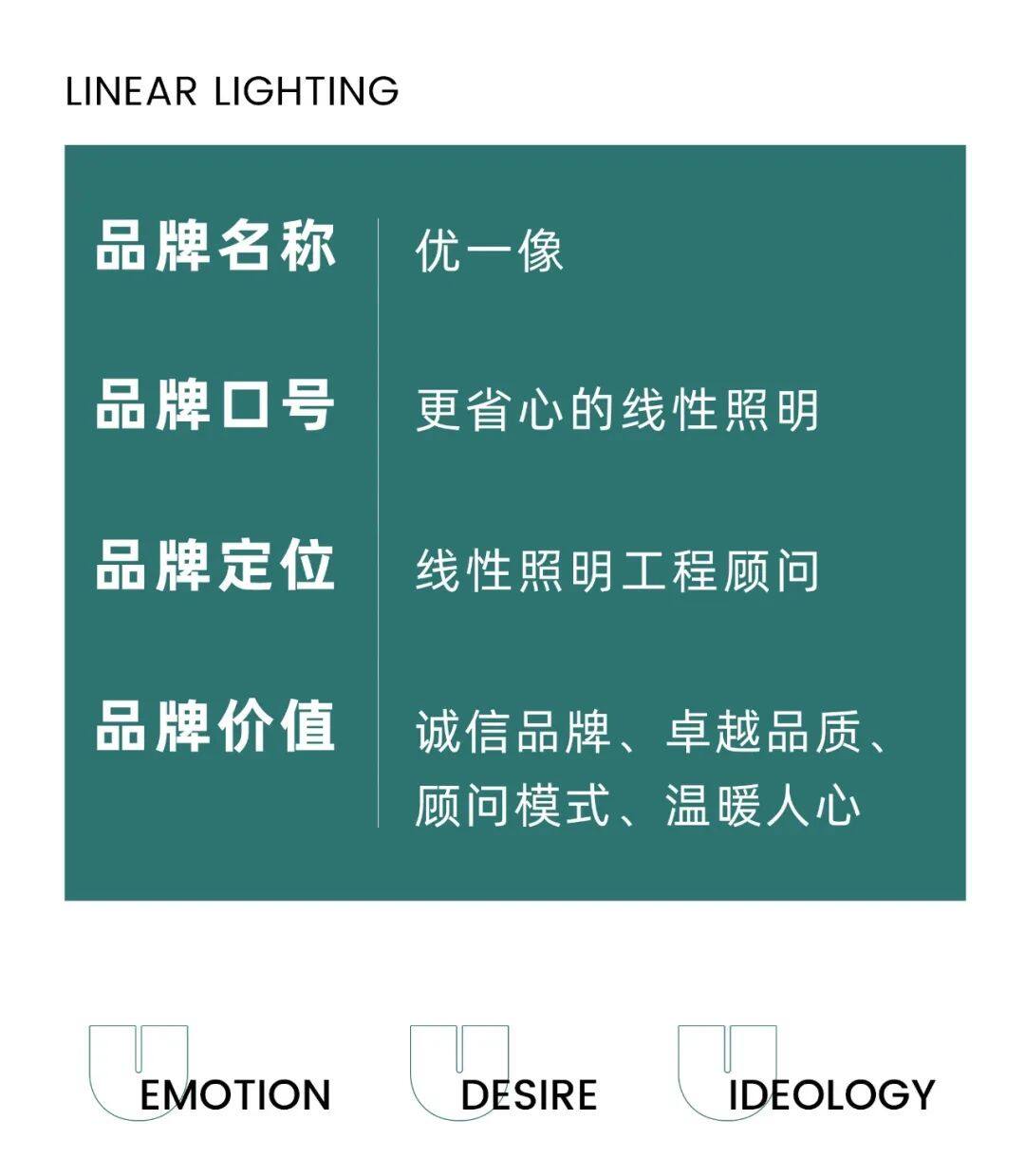 从构建品牌专业度出发,深圳摩登7团队助力优一像提炼出“更省心的线性照明工程顾问”这一核心主张,从品牌战略层面对其进行全方位的品牌升级,以为消费者打造美好生活为愿景,对外传达输出“舒适、专业、品质”的品牌形象;