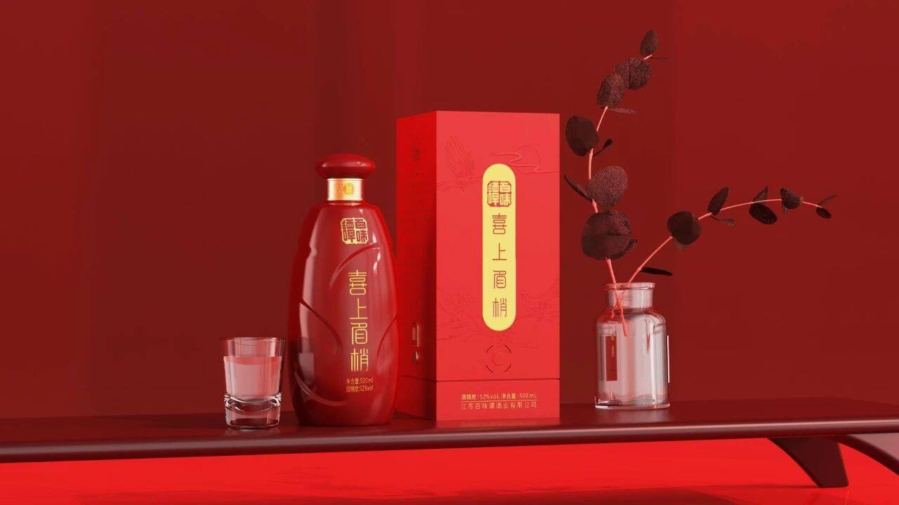 喜上眉梢系列,瓶口采用烫金瓶颈,印有“百味谭”和“喜”字回形花纹,细节彰显尊贵。瓶身灵动,形状似爆竹,饰以烟花状瓶纹。整体设计理念用红色搭配金色,包装内圆外方,给人以喜庆吉祥的感受。
