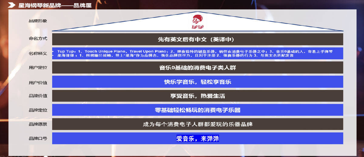 通过用户定位和品牌定位,结合日常生活娱乐场景的音乐体验需求,摩登7品牌咨询团队成功为星海钢琴打造了一个全新的子品牌——TupTup星海弹弹。这个品牌不仅体现了让所有人都能轻松接触和享受音乐的理念,也通过科学的品牌定位系统和创新的命名方式,为品牌未来的发展奠定了坚实的基础。